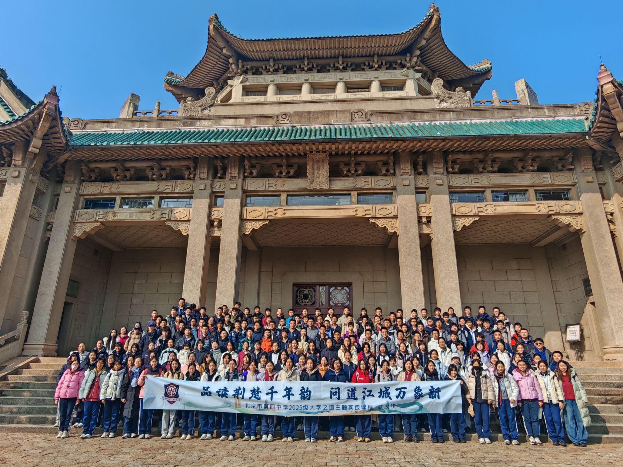 冬日的珞珈山,层林尽染,书香氤氲。2025年1月23日下午,北京四中189名师生怀揣着对学术殿堂的向往,走进武汉大学,开启了一场集校园探索、文化浸润与思想碰撞于一体的参访交流之旅。本次活动由武汉大学北京招生宣传工作组精心策划,旨在搭建校际沟通桥梁,让青年学子近距离感受武大的历史底蕴与学术魅力。