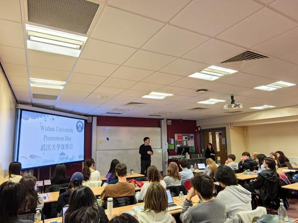 同学提前精心筹备,明确分工,从武大的校史文化、学科建设,到武汉的城市风貌、荆楚文化,再到中国的传统文化与现代发展,全方位梳理宣传内容,力求以最生动、最具体的方式,向杜伦大学的师生展现真实、鲜活的武大与中国。宣传日当天,杜伦大学的师生展现出对武汉大学、对中国文化的浓厚兴趣,宣讲教室座无虚席,不少师生甚至搬来椅子坐在走廊,现场气氛热烈。