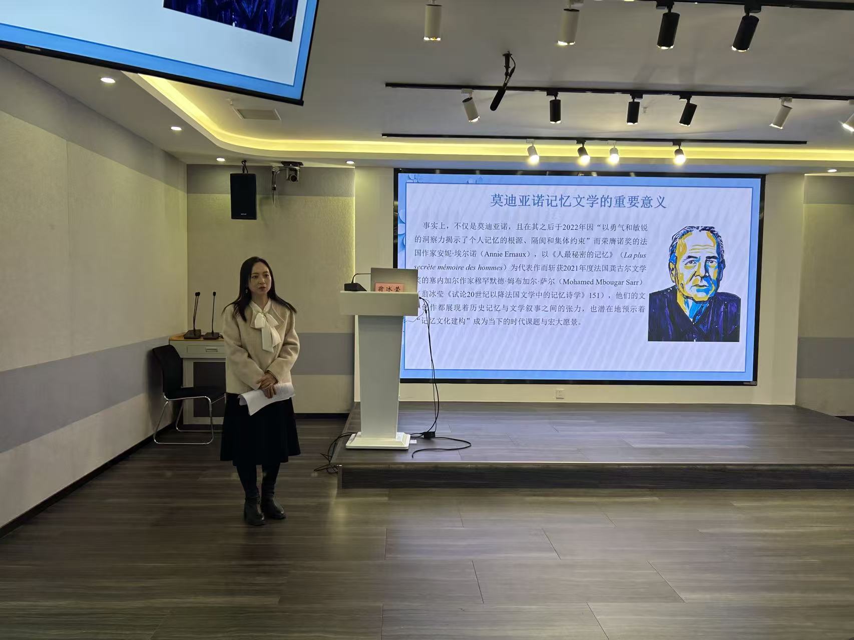 在讲座的最后,翁冰莹教授总结道,法国作家莫迪亚诺的记忆文学创作,是历史碎片与个体记忆的艺术重构,更是文学介入时代、叩问伦理的精神表达。因此,深入挖掘其记忆文化体系,是拓展法国文学研究视野、为当代文学与文化研究提供重要参照的关键路径。在交流互动环节,现场师生踊跃提问,围绕莫迪亚诺的创作手法、记忆伦理与新历史主义书写等问题展开深入交流,研讨氛围浓厚。与会师生纷纷表示,本次讲座分析内容深刻、视角新颖,让大家对莫迪亚诺的记忆叙事与历史书写有了更全面的认知,为相关领域的研究与探索带来了重要启发。