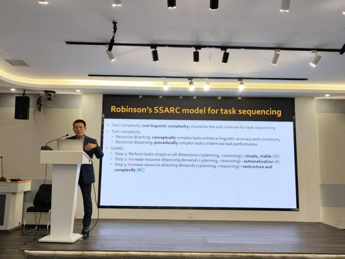 随后,李少锋教授系统梳理了TBLT实施的关键环节,包括需求分析、教学大纲设计、任务开发、任务排序及评估方式。他强调,任务设计应基于学习者与教师的实际需求与信念,任务排序可从低阶到高阶、从无聚焦到聚焦等维度展开,并结合SSARC模型分析任务在概念复杂度与程序复杂度上的发展路径。在实施层面,他介绍了任务前规划、示范、任务中反馈、任务重复以及“惊喜元素”等教学策略,并指出在任务后进行形式聚焦教学具有合理性。