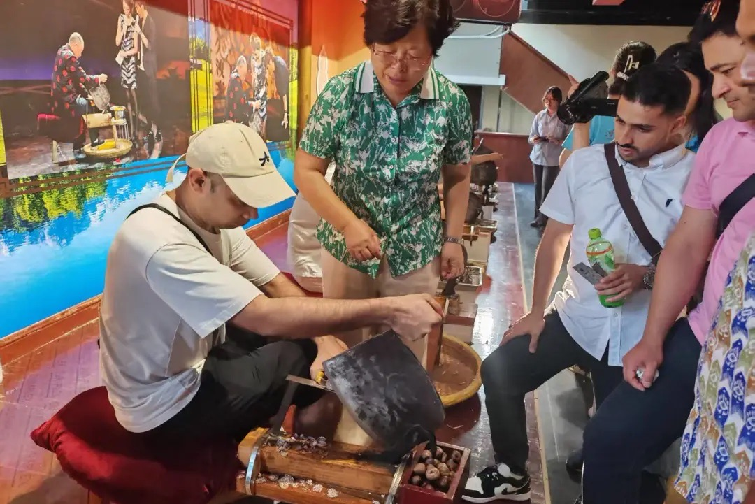 实践队走访河南华夏药材有限公司、河南青山药业和张仲景产业园,见证传统中药的现代化蜕变。华夏药材以“华夏药都”禹州为根基,构建道地药材种植、智能化生产、标准检测的全产业链体系,其DNA鉴别技术与古法炮制技艺并行,彰显“守正创新”理念。青山药业展览厅通过史料与实物展现禹州药都历史,非遗传承人朱改莲现场演示“象鼻满月刀”切制技艺,讲述“九蒸九晒”等制药古法,彰显了中医制药精神的传承与坚守。留学生们现场品尝了九蒸九晒的黑豆、地黄等中药,动手切配丹参,对中草药的制作与功效有了更为深刻的感受。张仲景产业园以中医药为核心,商业版图覆盖制药、药房、养生馆、食品加工等,是中医药市场化运营的成功代表。师生们在自动化生产线与传统工坊的匠心传承中,了解到中医药企业发展的智慧与坚守,感受中医药在今天的现代化蜕变。